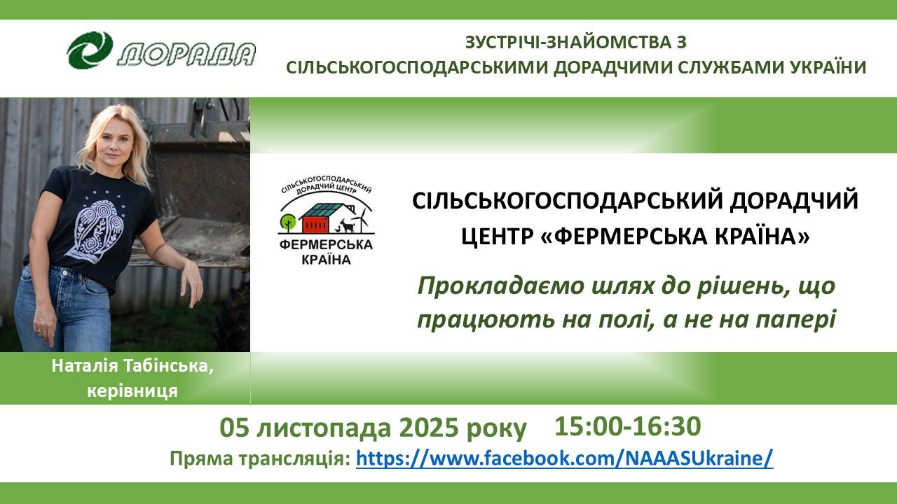 05 листопада 2025 року відбудеться знайомство-зустріч із Сільськогосподарським дорадчим центром «Фермерська країна», в рамках проєкту НАСДСУ «Зустрічі-знайомства з сільськогосподарськими дорадчими службами України».